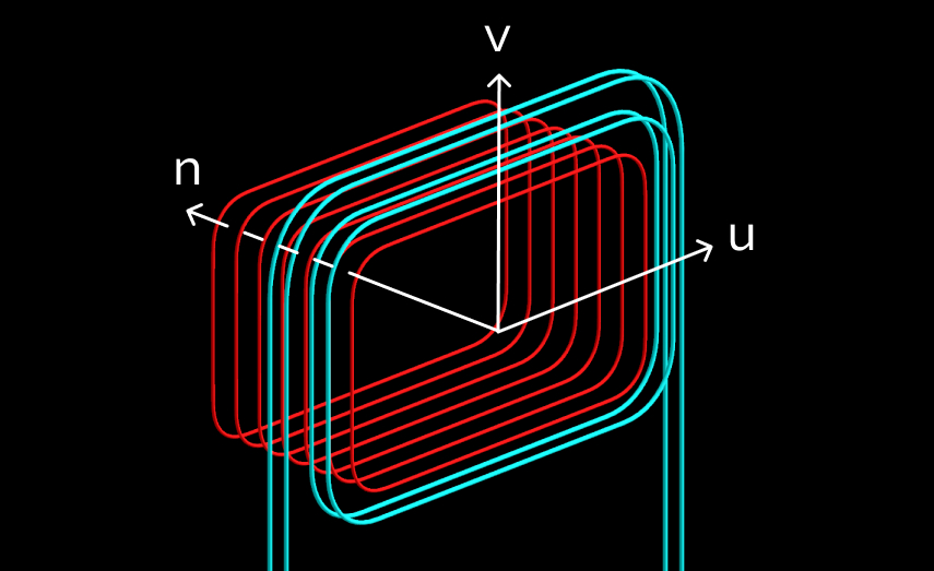 我们需要定义一个成像平面, 也就是背屏所在的平面。在世界空间中, 这个平面可以通过平面上一个点 , 平面法线 , 以及平面上两个单位向量 和 来定义。 为了方便, 我们选择屏幕中心为世界坐标原点, 并选择正交的三组单位向量, 这样 , 以此展开后续的计算。那么我们就有: