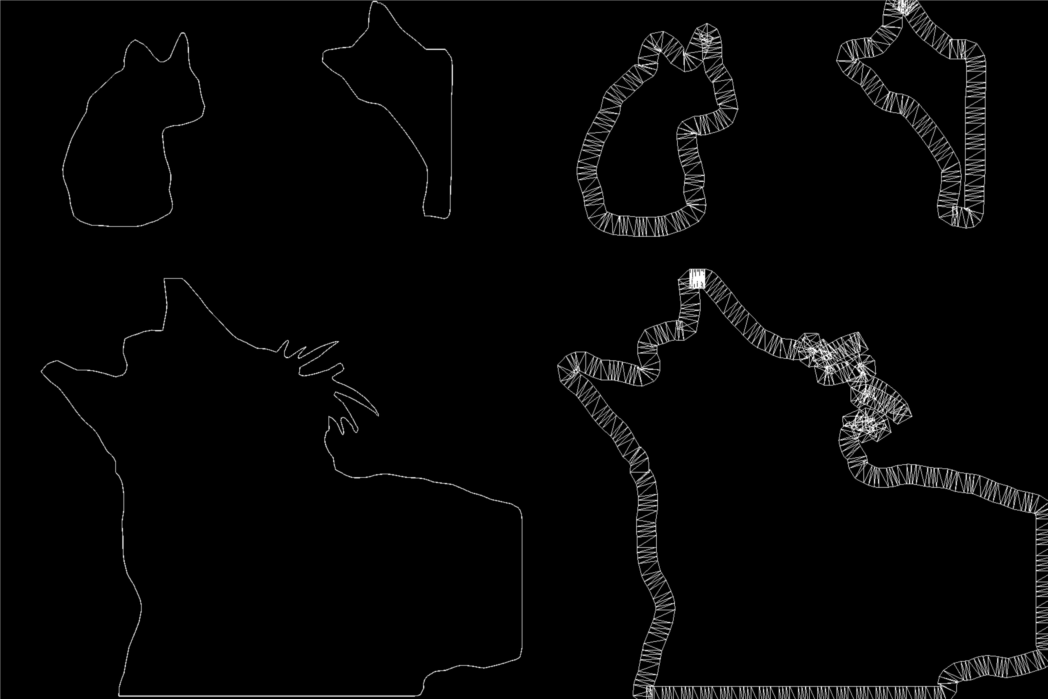抠图算法返回的是 json 格式的 path, 我们需要将这些 line segments 转换成 mesh line 以便渲染。 Path 转 Mesh Line 的方法已经有很多人分享过, 在这个项目中我们使用的是最基本的方法。如果感兴趣的 话可以看看下面这些文章。