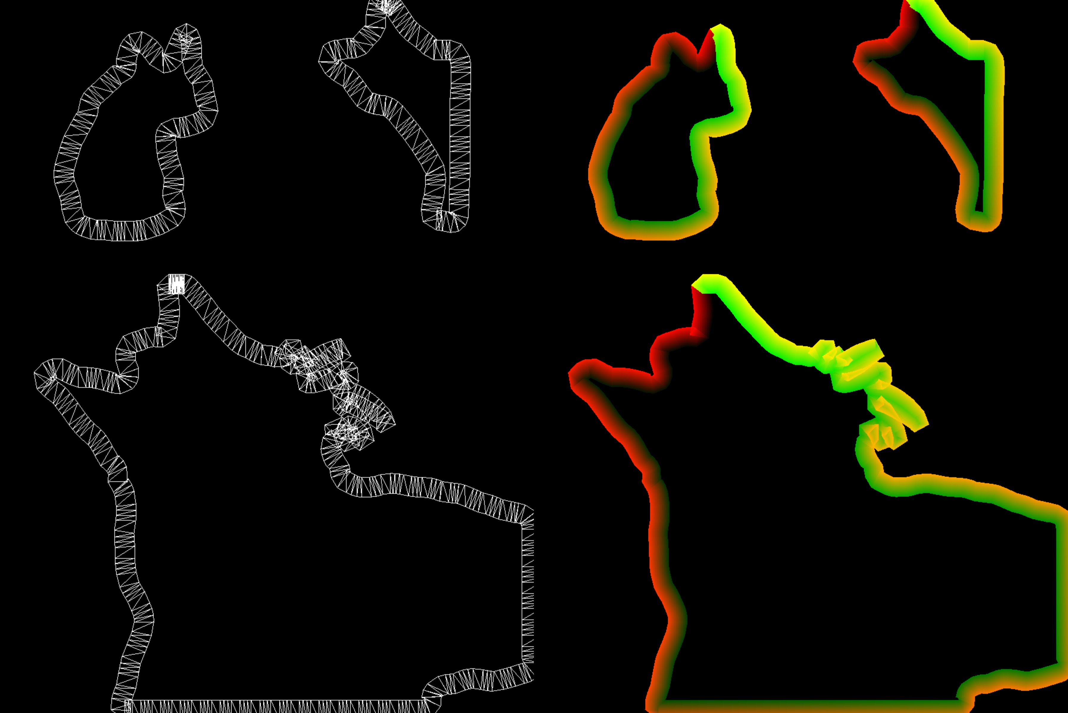 for (let j=0; j< segments.length; j++) { const cs = segments[j] // direction const v = cs.mp2.clone().sub(cs.mp1) const t0: Vector2 = t2 ?? cs.e1p1 let t1: Vector2 = t3 ?? cs.e2p1 t2 = j === segments.length - 1 ? segments[0].e1p1 : cs.e1p2 t3 = j === segments.length - 1 ? segments[0].e2p1 : cs.e2p2 // cross check // if (intercept(t1, t0, t3, t2, false)) { // t2 = t0 // t3 = t1 // continue // } // offset vertex by some amount along segment's normal. vertices.push( t1.x / scale.x - 0.5, 0.5 - t1.y / scale.y, 0.0 ) vertices.push( t0.x / scale.x - 0.5, 0.5 - t0.y / scale.y, 0.0 ) vertices.push( t2.x / scale.x - 0.5, 0.5 - t2.y / scale.y, 0.0 ) vertices.push( t3.x / scale.x - 0.5, 0.5 - t3.y / scale.y, 0.0 ) vertices.push( t1.x / scale.x - 0.5, 0.5 - t1.y / scale.y, 0.0 ) vertices.push( t2.x / scale.x - 0.5, 0.5 - t2.y / scale.y, 0.0 ) ... }