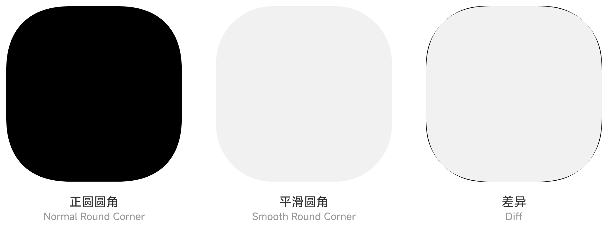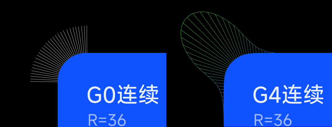 我们最常用的正圆圆角 (左) 在与直线相交时, 曲率突变, 加上屏幕像素的限制, 会导致视觉上的不连续感。 而我们提出的高级材质圆角 (右) 通过曲率连续性的提升, 使得曲线在与直线相交时, 曲率平滑过渡, 视觉上更加舒适。