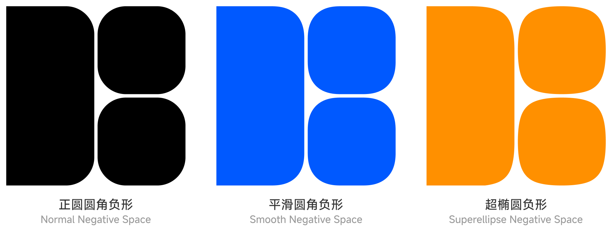 我们不仅仅一味追求圆角的平滑度, 而是尽可能保证在系统内的任何使用场景中都能与其他元素配合达到整体视觉协调。 一圆角矩阵排列时所呈现的负形空间为例。 如果只是单纯地追求圆角平滑度, 拥有完美解析式的超椭圆将会是更好的选择, 因为它很显然满足无穷阶曲率连续。