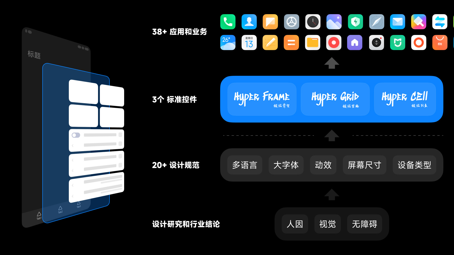 HyperOS 是小米公司的下一代操作系统, 为了适应不同屏幕尺寸、分辨率、设备类型, 我们设计了一套全新的、打通全流程的自适应设计系统和SDK。 设计系统包含的内容十分庞杂, 包括导航模式、颜色、字体、图标、间距、布局、圆角、阴影, 常用控件等。