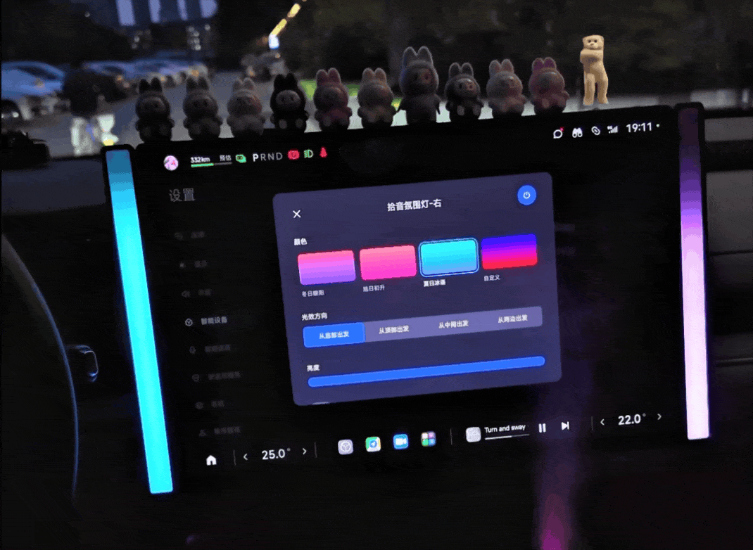 它由两个条形LED灯带组成, 通过获取车内正在播放音乐的节奏信息, 变化灯带的颜色和亮度。